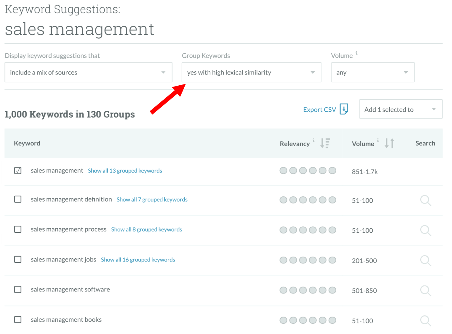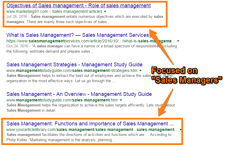 In our case, we chose “sales management” as the target keyword.