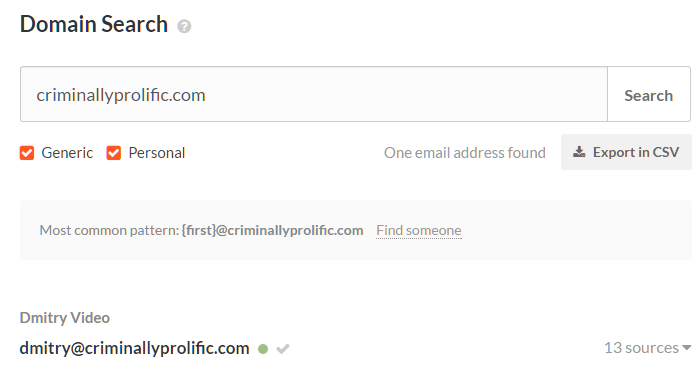 Once you have a name, plug the domain name into Hunter.io to get an email address guess of important contacts.