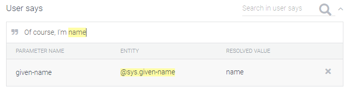 The right things to say are included in the “User says” section (screenshot below). You set either exact phrases or lists of options as the necessary input. For instance, a user could write “Of course, I’m [any name]” or “Of course, I’m [any temperature].” You could set up one intent for name-is which matches “Of course, I’m [given-name]” and another intent for temperature which matches “Of course, I’m [temperature],” and depending on whether your user writes a name or temperature in that final block you could activate either the “name-is” or “temperature-is” intent.