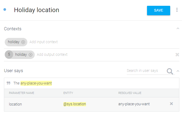 The “right time” is defined by contexts. Contexts help define whether an intent will be activated, but are also created by certain intents. I’ve included a screenshot below of an example interaction. In this example, the user says that they would like to go to on holiday. This activates a holiday intent and sets the holiday context you can see in input contexts below. After that, our service will have automatically responded with the question “where would you like to go?” When our user says “The” and then any location, it activates our holiday location intent because it matches both the context, and what the user says. If, on the other hand, the user had initially said “I want to go to the theater,” that might have activated the theater intent which would set a theater context — so when we ask “what area of theaters are you interested in?” and the user says “The [location]” or even just “[location],” we will take them down a completely different path of suggesting theaters rather than hotels in Rome.