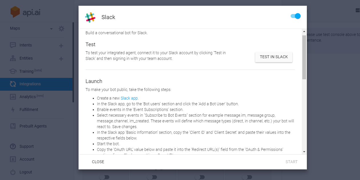 Slack includes instructions for an app lifecycle here, but API.AI actually has excellent instructions for how to set up your app; as a first step, create a simple back-and-forth conversation in API.AI (not your full product), go to integrations, switch on Slack, and run through the steps to set it up. Once that is up and working, you’ll need to change the OAuth URL and the Events URL to be the URL for your app.