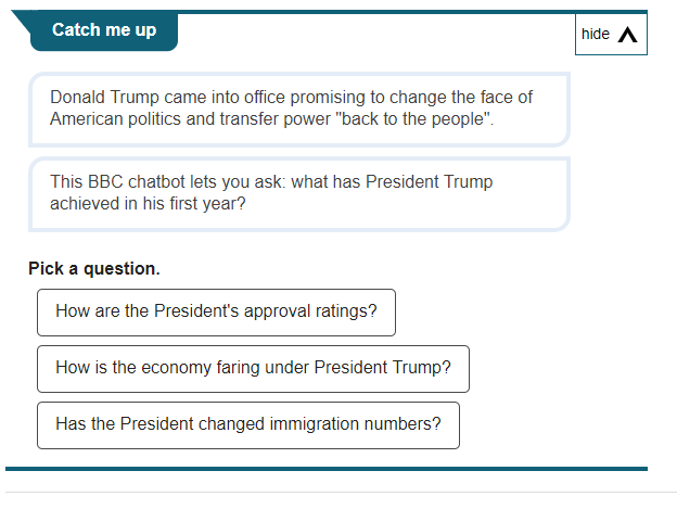 One of my most recent favorites is an innovation from the BBC News Labs and Visual Journalism teams, who have launched a bot-builder app designed to, per Nieman Lab, “make it as easy as possible for reporters to build chatbots and insert them in their stories.”