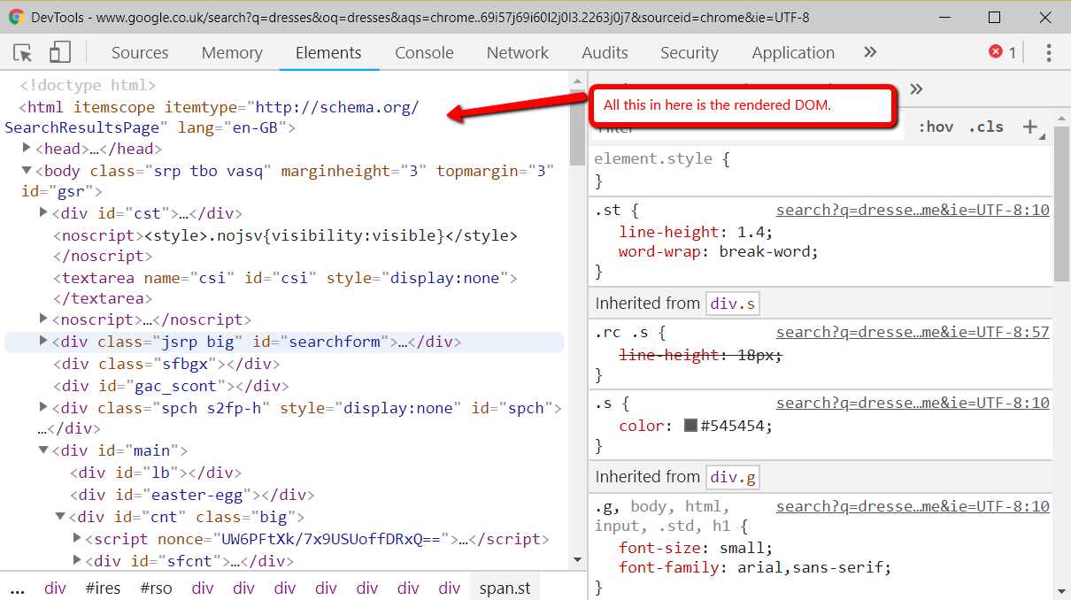 - While this won’t show you the rendered DOM, it is showing you the raw HTML Googlebot actually saw when visiting the page. You’ll need to check this with JS disabled; otherwise, on opening it, your browser will run all the JS on the cached version.