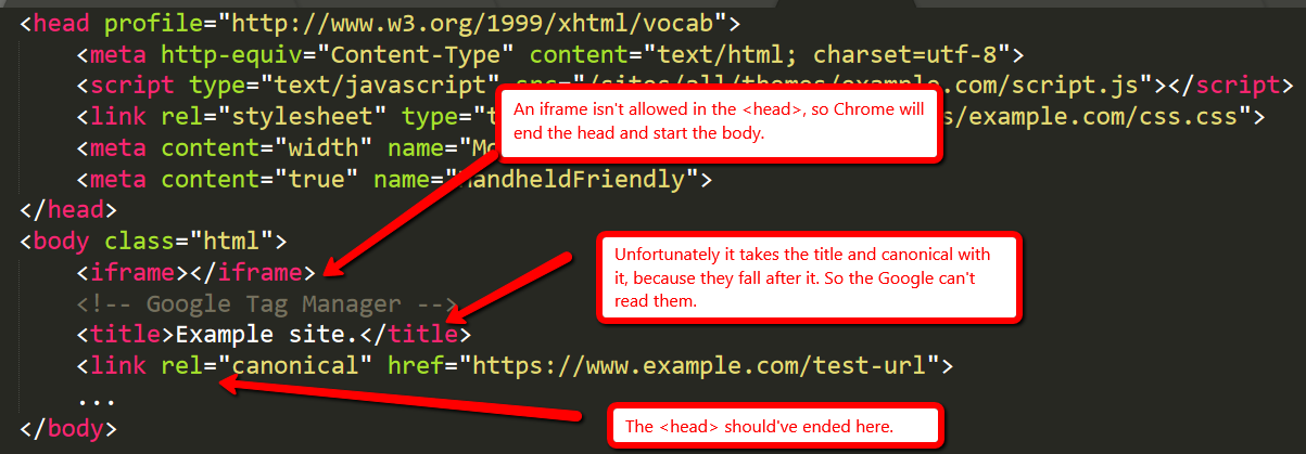 An iframe isn't allowed in the head code, so Chrome will end the head and start the body. Unfortunately, it takes the title and canonical with it, because they fall after it — so Google can't read them. The head code should have ended in a different place.