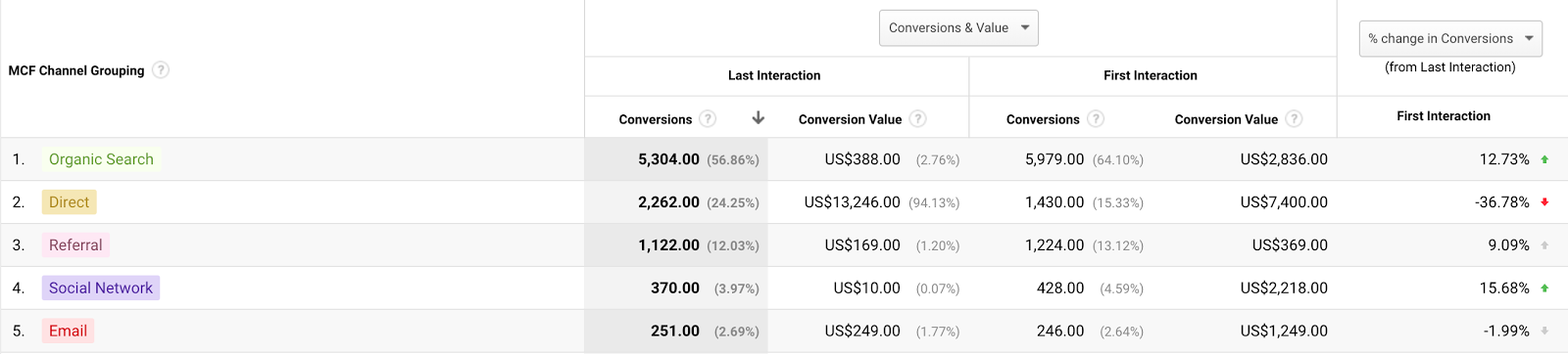 In this screenshot we see that although first-touch dramatically reduces the influence of direct, for instance, it still accounts for more than 15% of new revenue.