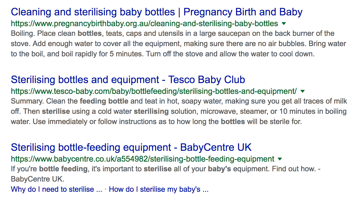 One time that I can specifically recall noticing this tendency growing in myself was when I started doing tons more baby-related searches after my first child was born. Up until that point, I had effectively zero brand affinity with anyone in the space, but I quickly grew to rate the content put out by babycentre (babycenter in the US) and I found myself often clicking on their result in position 3 or 4 even when I hadn’t set out to look for them, e.g. in results like this one: