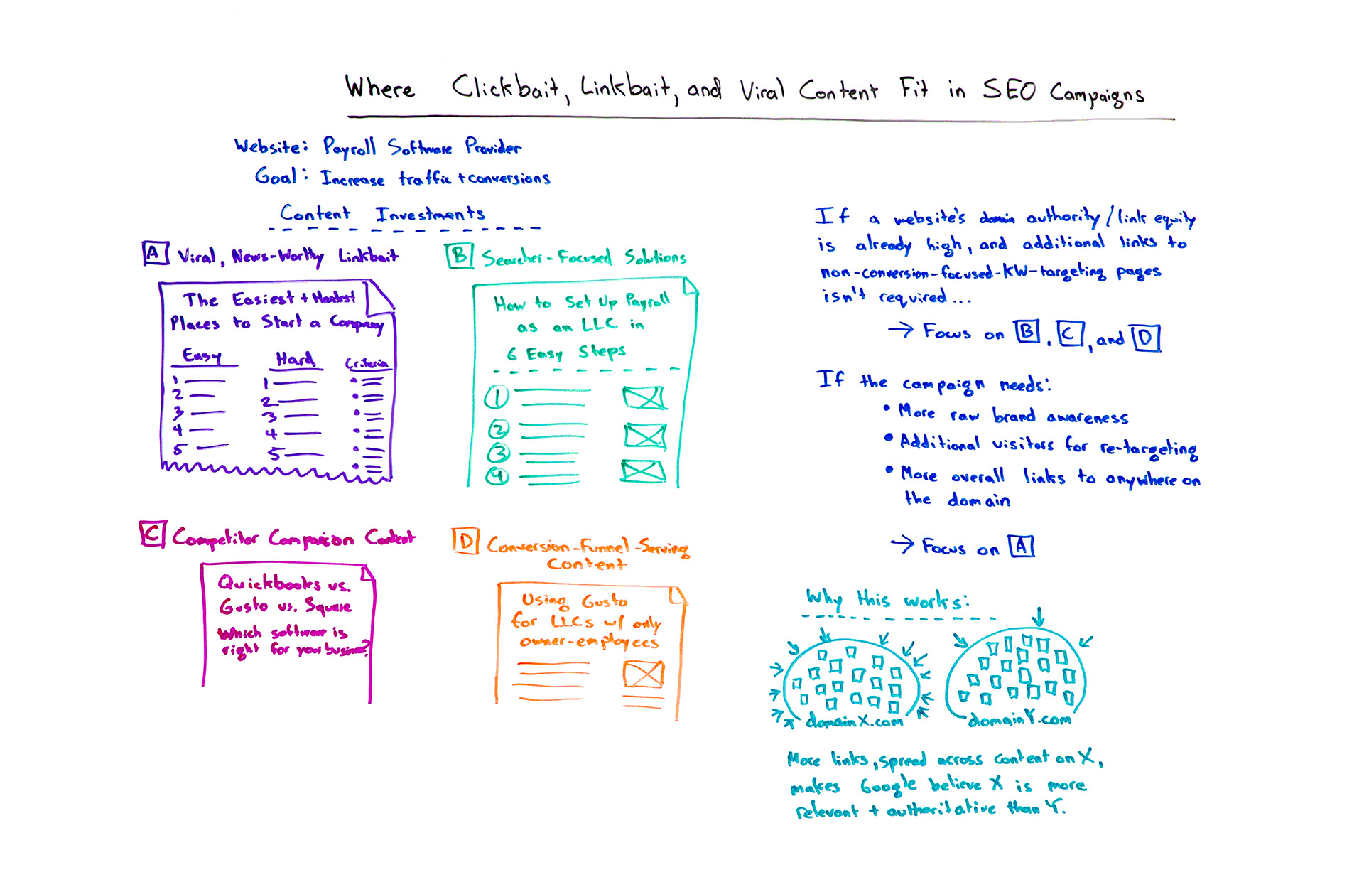 When is it smart to focus on viral-worthy content and clickbait? When is it not? To see fruitful returns from these kinds of efforts, they need to be done the right way and used in the right places. Rand discusses what kind of content investments make sense for this type of strategy and explains why it works in this week's Whiteboard Friday.