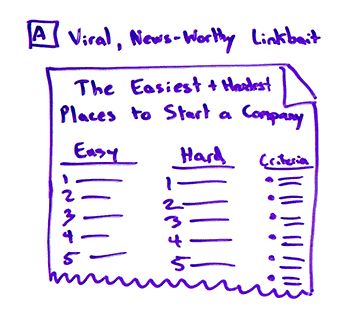 So this might be something like "The Easiest and Hardest Places to Start a Company." Maybe it's countries, maybe it's states, regions, whatever it is. So here are the easy ones and the hard ones and the criteria, and you go out to a bunch of press and you say, "Hey, we produced this list. We think it's worth covering. Here's the criteria we used." You go out to a bunch of companies. You go out to a bunch of state governments. You go out to a bunch of folks who cover this type of space, and hopefully you can get some clickbait, some folks actually clicking, some folks linking.