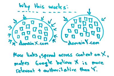 So, from Google's perspective, it works because in the case where Google sees DomainX.com, which has lots of pages earning many, many different links from all around the web, and DomainY.com, which may be equally relevant to the search query and maybe has just as good content but has few links pointing to it and those links, maybe the same number of links are pointing to the specific pages targeting a specific keyword, but overall across the domain, X is just much, much greater than Y. Google interprets that as more links spread across the content on X makes the search engine believe that X is more authoritative and potentially even more relevant than Y is. This content has been referenced more in more different ways from more places, therefore its relevance and authority are perceived as higher. If Y can go ahead and make a viral content investment that draws in lots and lots of new links, it can potentially compete much better against X.