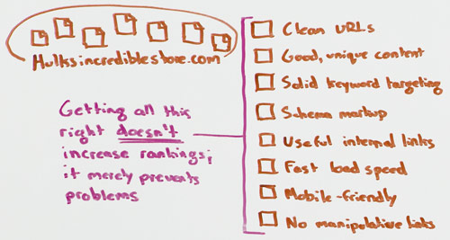 This makes a lot of people stop investing in SEO, stop believing in SEO, and stop wanting to do it. I can understand where you're coming from. The challenge is not one of you've done something wrong. It's that this stuff, all of these things that you do right, especially things that you do right on your own site or from a best practices perspective, they don't increase rankings. They don't. That's not what they're designed to do.
