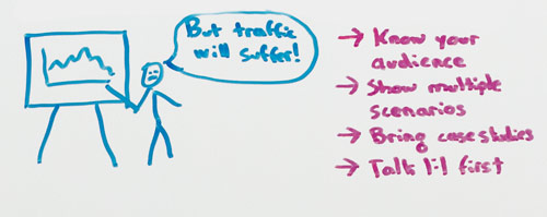 Some ways to get around this are, first off, know your audience. If you know who you're talking to in the room, you can often determine the things that will move the needle for them. For example, I find that many managers, many boards, many executives are much more influenced by competitive pressures than they are by, "We won't do as well as we did before, or we're losing out on this potential opportunity." Saying that is less powerful than saying, "This competitor, who I know we care about and we track ourselves against, is capturing this traffic and here's how they're doing it."