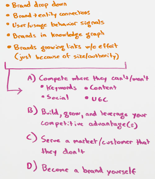 You better be building, growing, and leveraging your competitive advantage. Whenever you build an organization, you've got to say, "Hey, here's who is out there. This is why we are uniquely better or a uniquely better choice for this set of customers than these other ones." If you can leverage that, you can generally find opportunities to compete and even to win against big brands. But those things have to become obvious, they have to become well-known, and you need to essentially build some of your brand around those advantages, or they're not going to give you help in search. That includes media, that includes content, that includes any sort of press and PR you're doing. That includes how you do your own messaging, all of these things.