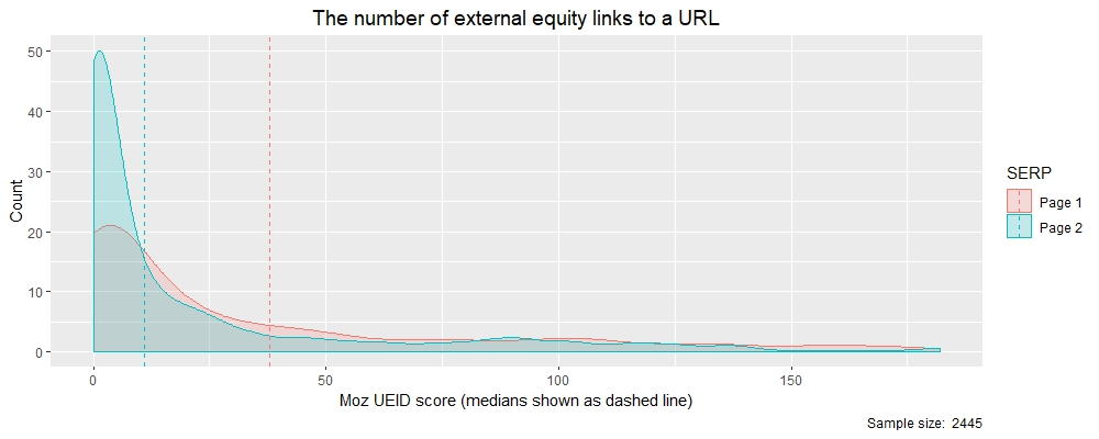 The inference from these two density plots is that Page 1 SERP results had more external equity backlinks (UEIDs) on than Page 2 results. You can also see the median values for these two categories below which clearly shows how the value for Page 1 (38) is far greater than Page 2 (11). So we now have some numbers to base our SEO strategy for backlinks on.