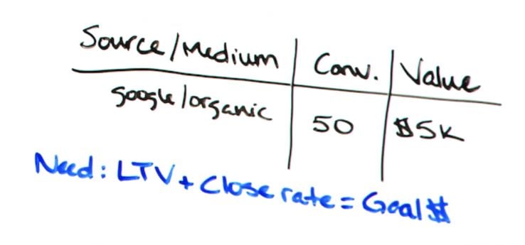 They want to be able to prove that what they're doing is beneficial in terms of revenue. So one way to do this is to get the lifetime value of the customer, multiply that by the close rate so that you can have a goal value. Now if you turn on your conversions and set up your goals in Google Analytics, which you I think should be doing, this assumes that you're not an e-commerce site.