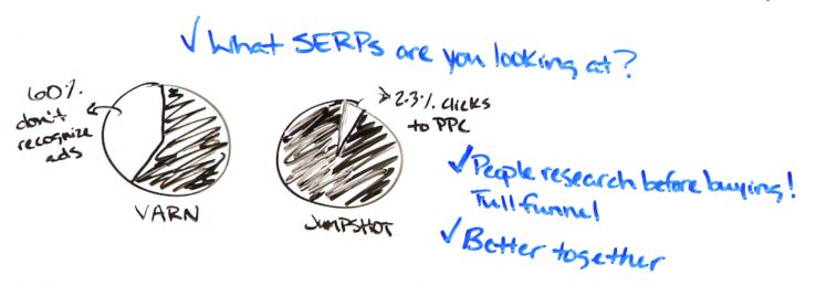 I think this was put out sometime last year by Varn Research, and it said that 60% of people, when they see ads on the search results, they don't even recognize that they're ads. That's actually probably higher now that Google changed it from green to black and it kind of blends in a little bit better with the rest of it. But then this data from Jumpshot says that only about 2% to 3% of all search clicks go to PPC.