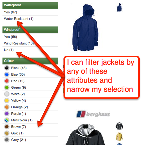 In doing so, you may find that there is a high search volume for keywords that include "North Face" + "waterproof jackets." This means that you will want a landing page for "North Face waterproof jackets" to be crawlable and indexable. You may also want to make sure that the database attribute has an SEO friendly URL, so rather than "waterproof-jackets/?brand=5" you will choose "waterproof-jackets/north-face/." You also want to make sure that these URLs are part of the navigation structure of your website to ensure a good flow of PageRank so that users can find these pages easily.