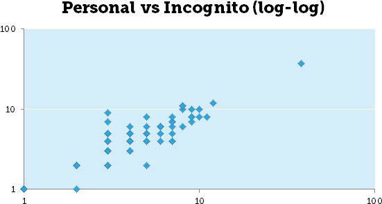 Interestingly, almost all of the methods showed very strong agreement, with Personalized vs. Incognito showing the most agreement (not surprisingly, as both are browser-based). Here’s a scatterplot of that data, plotted on log-log axes (done only for visualization’s sake, since the rankings were grouped pretty tightly at the upper spots):