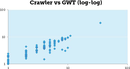 Crawler vs. GWT had the lowest correlation, but it’s important to note that none of these differences were large enough to make a strong distinction between them. Here’s the scatterplot of that correlation, which is still very high/positive by most reasonable standards:
