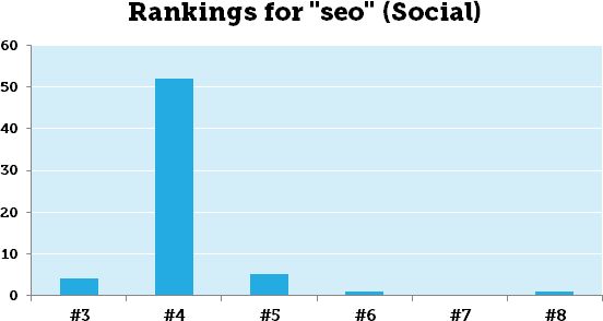 As of this writing, I was showing Moz.com in the #4 spot, so I called in some help via social media. I asked people to do a logged-in (personalized) search for “seo” and report back where they found Moz.com. I removed data from non-US participants, which left 63 rankings (36 from Twitter, and 27 from Facebook). The reported rankings ranged from #3 to #8, with an average of 4.11. These rankings were reported from across the US, and only two participants reported rankings at #6 or below. Here’s the breakdown of the raw data: