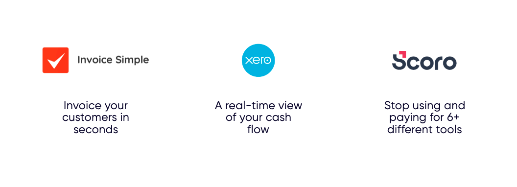 Let’s take a look at three more. Invoice Simple says you can invoice customers in seconds. Xero gives you a real-time view of your cash flow. Scoro says they can help you stop using and paying for six or more different tools.
