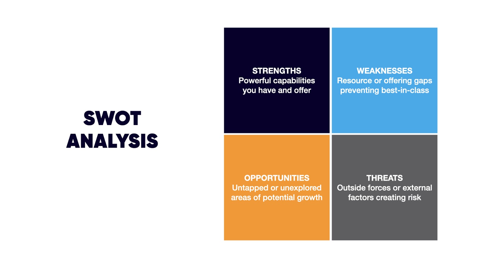 Strengths are the powerful capabilities and value you bring to the table. Weaknesses are the gaps in your resources or offerings that might hold you back from being best in class. Opportunities are untapped or unexplored areas of potential growth. Threats are outside forces or external factors that put your business at risk - like economic downturn and susceptibility global pandemic, for example, or the entry of a disruptive new competitor.