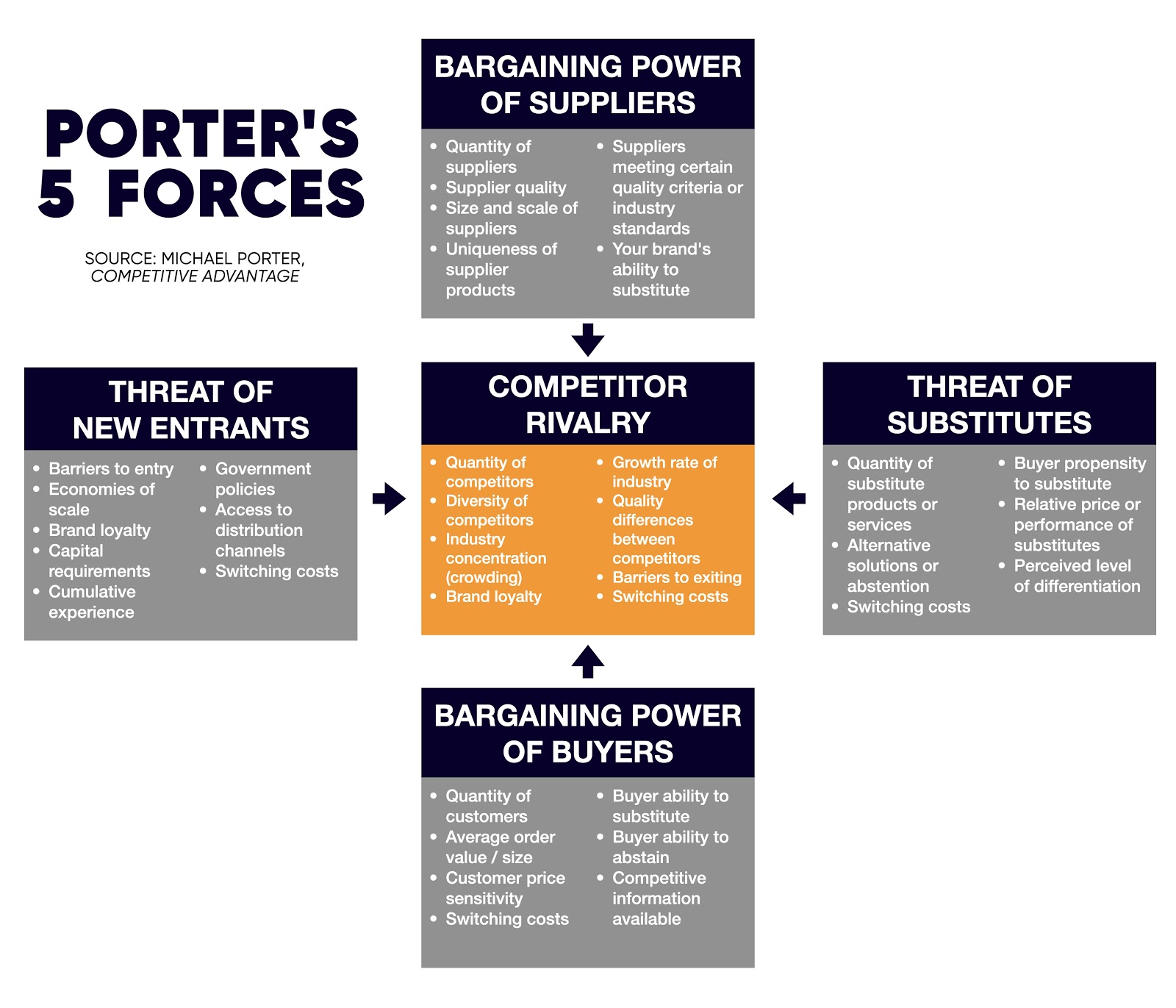 The first force at the center of the model is competitive rivalry. What is the quantity, quality, and diversity of your competitors in the space? How fast or slow is the industry currently growing? What's the growth potential in the future? Are customers typically loyal to a brand, or are they brand-agnostic, switching a round frequently in your industry?