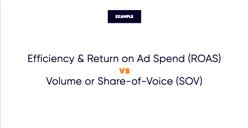 One problematic example I heard from a big client was challenging our Paid and Organic Search teams to win at efficiency and return on ad spend, while also winning on volume and share-of-voice concurrently. Efficiency and ROAS focus on a selective approach to advertising on certain terms or topics to optimize for the most efficient acquisitions and cost savings, and it often results in a narrower reach but highly efficient use of advertising dollars. On the flip-side, focusing on volume or achieving the largest share-of-voice in a space typically requires casting a wider net, and that traffic may convert at a lower rate and profit margins and ROAS may be tighter.