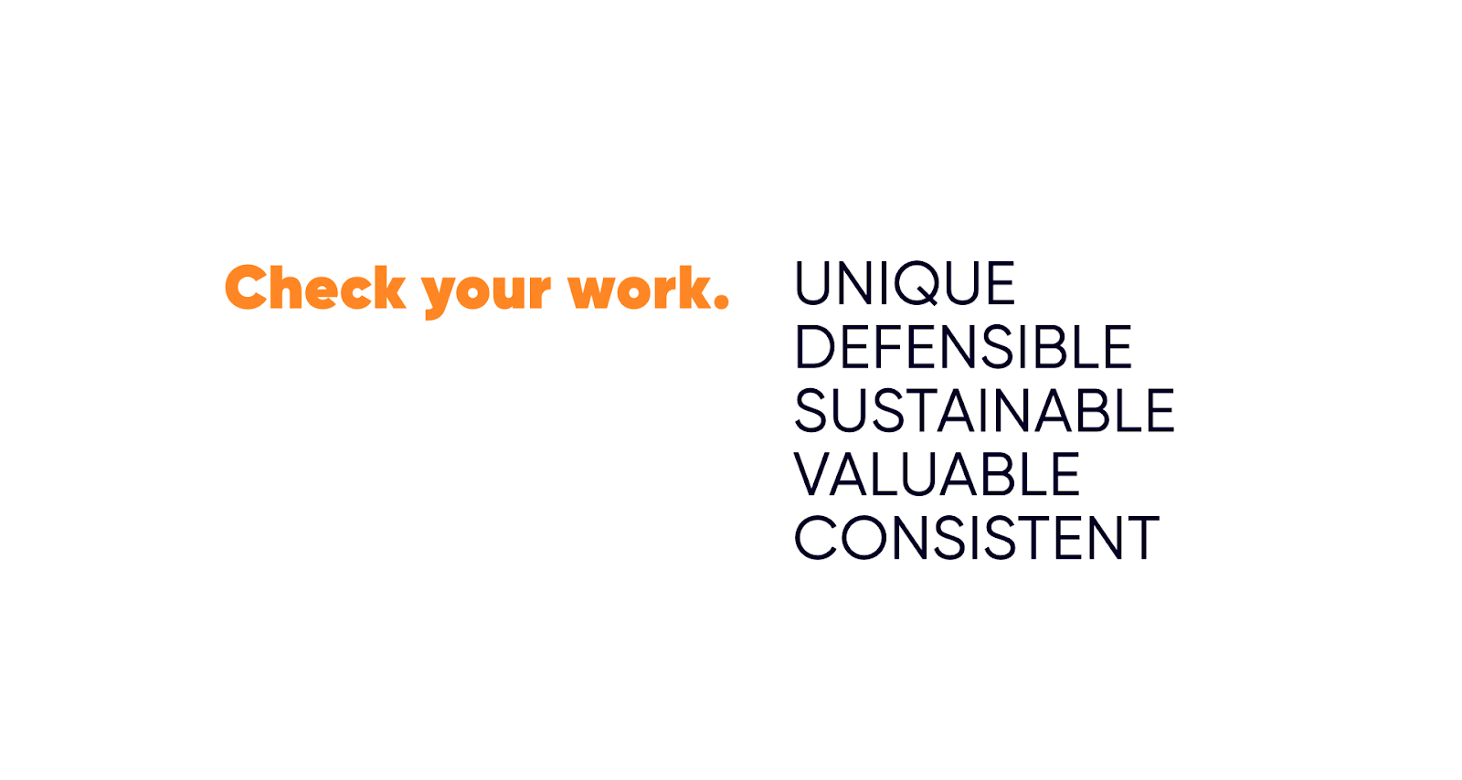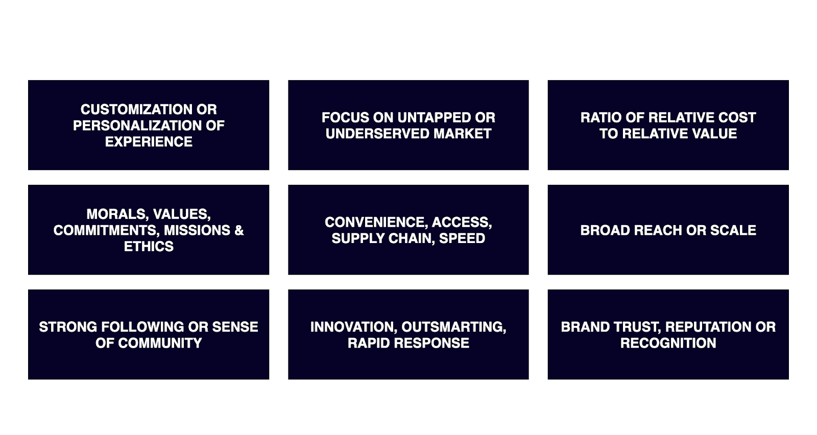 Start with your “est.” Best. Fastest. Smartest. Cheapest. Most innovative. Most horizontally integrated. What is something that better delivers more value to customers, or comparable value for a better price? This is a great brainstorming exercise to ask yourself initially what you are or want to be best at. Keep in mind, maybe it's not the "est" over all - maybe it's the "est" for a specific segment of your audience or need state of your customer or even just a geographic region. But then you have to check those "ests" against a few criteria to ensure it's really a competitive advantage.