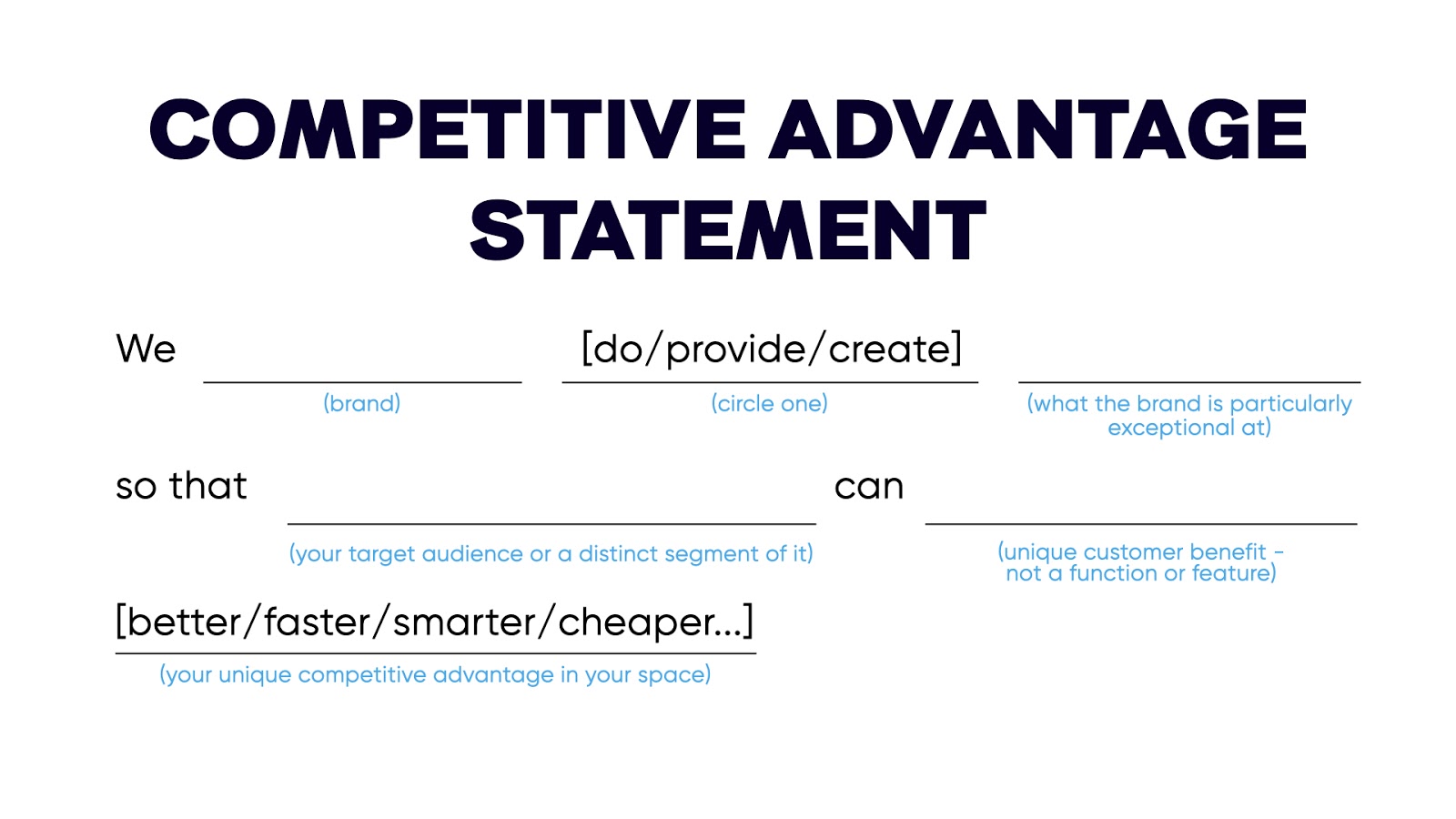 Now that you’ve done your due diligence, it’s time to boil it down to a simple brand statement to make it crystal clear what your competitive advantage will be. Please note that this should not be a simple exercise. If it's too easy, be skeptical of whether you have truly found your competitive advantage. Put in the work. Writing these statements is hard and takes time. And you should expect to revisit and revise over time as your competitive environment and customer preferences evolve.