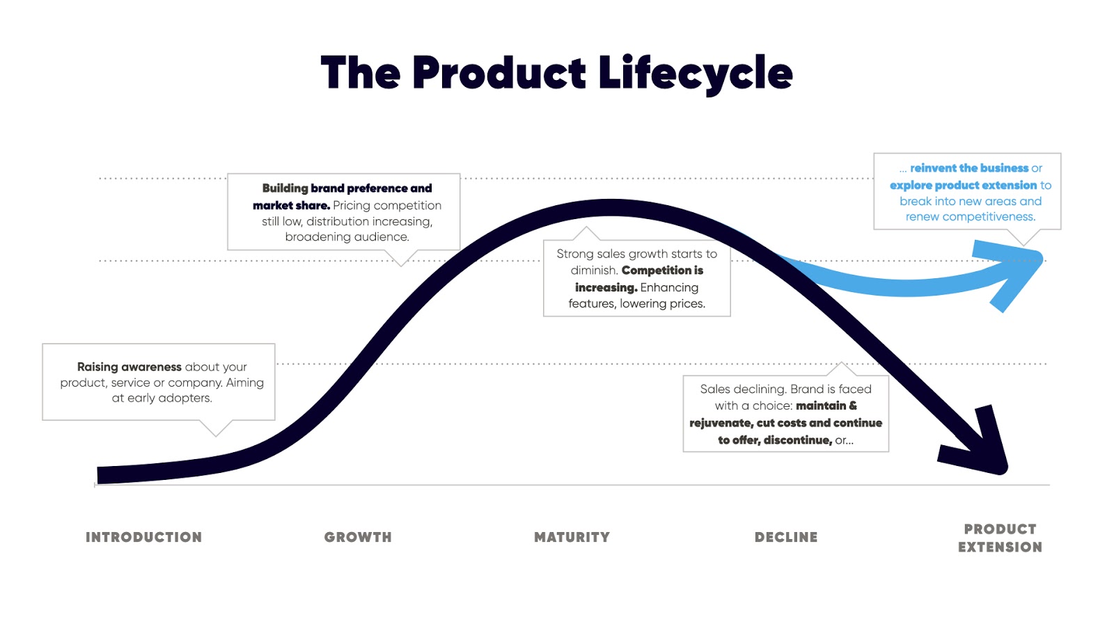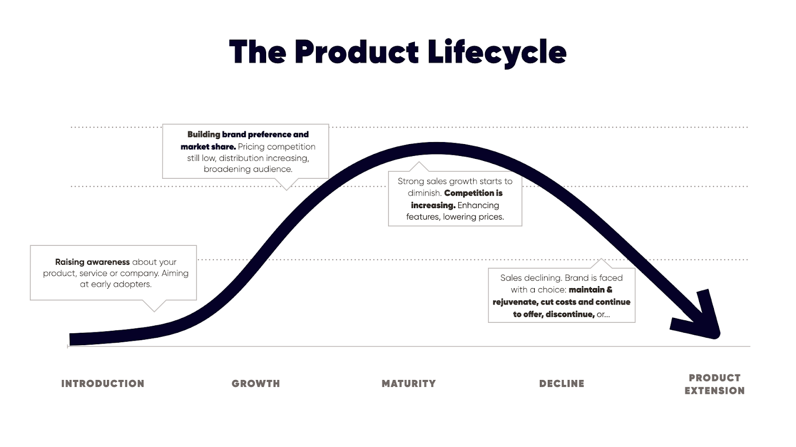 When a new brand emerges with a new product, service, audience, or competitive advantage, much of the effort and investment is spent raising awareness and amassing your first customers. Then you start to build up preference for your brand and increase your market share. Competition may be lower at this stage, and you're getting some scale, growing your audience. Then your steep growth trajectory starts to level off. The competition sees that you're onto a good thing and they start cutting into your piece of the pie. You may fight it by adding more features, or perhaps you lower your price.