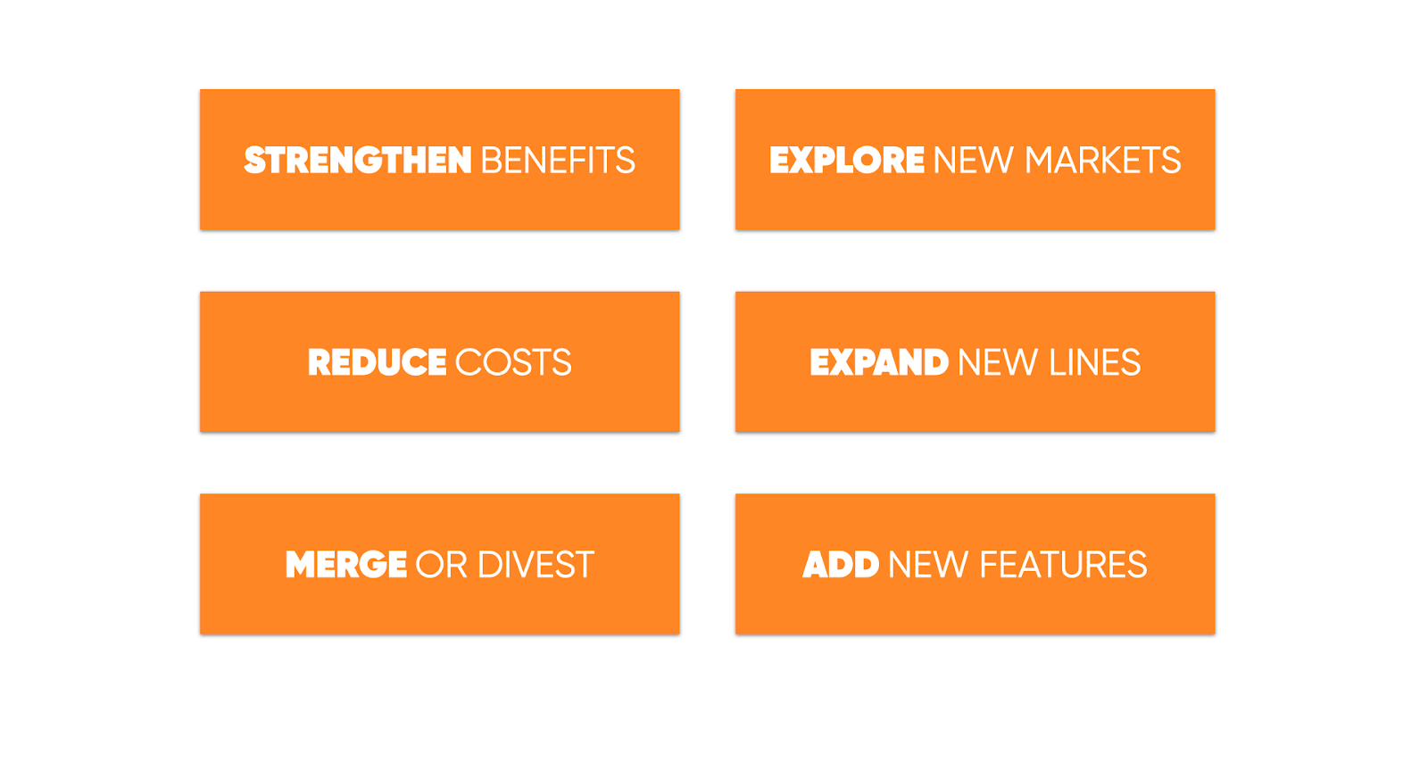 - Or you can go through mergers and acquisitions (join forces) or even divest certain pieces of the business (stop offering) to be able to focus on a new competitive advantage.