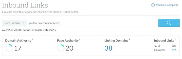 For our example here, I've chosen a random gardening company in Durham, North Carolina called Garden Environments. The website has a Domain Authority of 17 with 38 root linking domains.