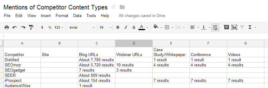 So what I have done is built out a spreadsheet for you, a rough tool, using IMPORTXML to scrape the number of results that a site has for the content type. If you're at all good with scraping in Gdocs, you can make this sheet customized to fit your needs and content types I'm sure!