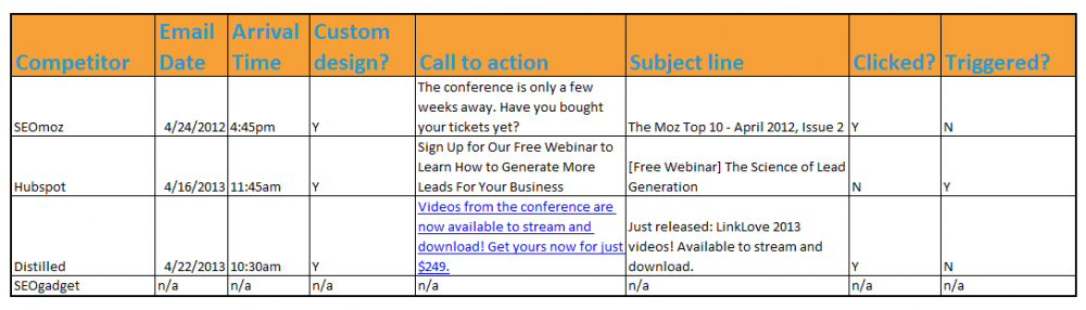 If you're interested in investing in email marketing, I'd first suggest that you subscribe to your competitors' email lists so that you receive emails whenever they send them to their entire list. You won't be able to learn how they're segmenting their lists, but you'll find their frequency, their subject lines that get you to click, and how they are calling you to action. Stephen Pavlovich talked about this at Searchlove New York in 2011, where he suggested that you save your competitor's emails to your Evernote, with a specific tag, so that you can go back and get ideas for your own emails. While this is an amazing tip that we should all do, it's step 1 and we should all go further. I like to take the emails sent by my competitors and analyze them in an Excel spreadsheet, taking into account: