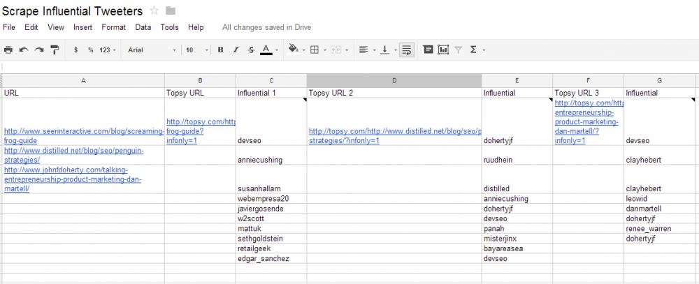 This is all well and good, but want to do it faster? I built a spreadsheet for you where you can take a URL and it builds the Topsy URL for you, then scrapes the Influential people. Once again, throw this into a Wordle (or Tagxedo, which is more stable) and see who the influencers are!
