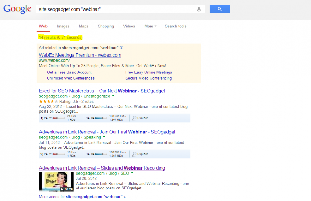 Using the information gleaned from the Wordle above, I can then go run advanced queries in Google to find how much my competitors are talking about the different content types listed. For example, if I run a [site:seogadget.com "webinar"] search, I get 14 results: