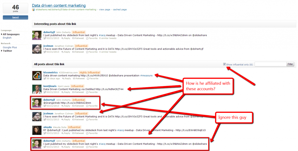 Since you now know what kind of content they are creating, you can figure out their social promotion strategy outside of their own accounts. Who are their tweeterati (aka, who shares their posts)? Better than that, who are the influential people that share their content? Once you find this, you can then decide whether you will be able to get those same people to promote your content, and how to do that, or if you need to find new people to connect with solely (using a tool like FollowerWonk).