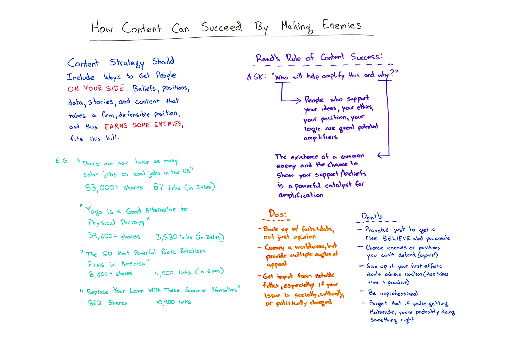 Getting readers on board with your ideas isn't the only way to achieve content success. Sometimes, stirring up a little controversy and earning a few rivals can work incredibly well — but there's certainly a right and a wrong way to do it. Rand details how to use the power of making enemies work to your advantage in today's Whiteboard Friday.