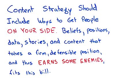 So, in my opinion, I think that companies and businesses, programs, organizations of all kinds, efforts of all kinds tend to do really well when they get people on their side. So if I'm trying to create a movement or I'm trying to get people to believe in what I'm doing, I need to have positions, data, stories, and content that can bring people to my site. One of the best ways to do that is actually to think about it in opposition to something else, basically try and figure out how you can earn some enemies.