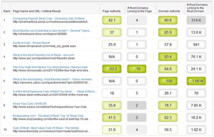 There's results that touch on expensive cuts of steak, of types of beef itself (like Wagyu & Kobe), on what makes a steak more flavorful, and there's a site showing up (Niman Ranch) that seems totally out of place when you look at the link numbers, but makes a lot of sense as a highly co-cited brand name. For reference, here's a basic keyword difficulty report for the phrase:
