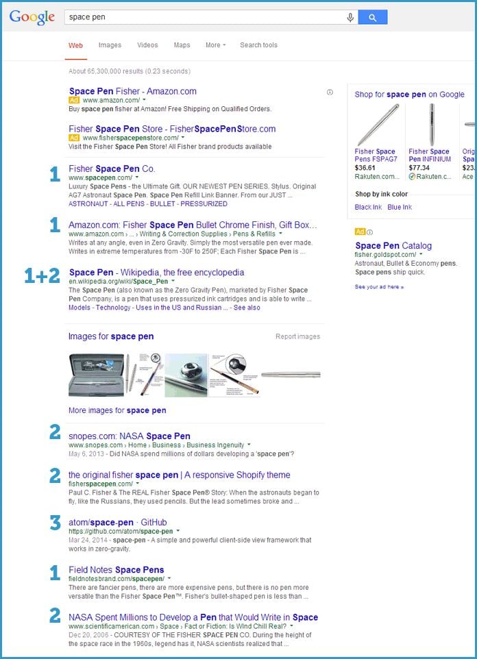 I'll try to illustrate this with an example. Here's a query for " space pen" in Google US (non-personalized with geo-biasing removed):