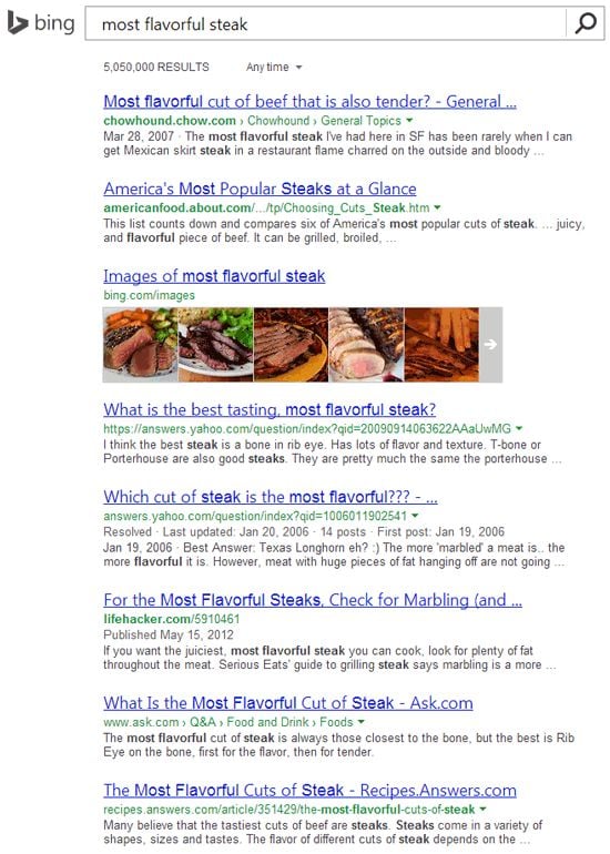 What's remarkable is how Google has made shifts in queries like this in the last couple years. If I performed this query in 2012 (which I'm fairly sure I did, but sadly didn't screenshot), I would have seen a lot more keyword-matching and a much more singular focus on articles that specifically mentioned "flavorful" (or fairly direct synonyms thereof) in the title and headline. Actually, it would look a lot more like Bing's results (no offense to them; these results are actually quite good, too, just far more keyword match-focused):
