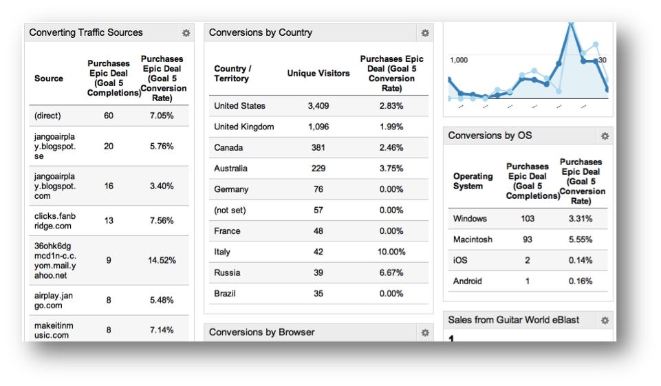 - Setup a GA dashboard to identify technical glitches in your content and/or keep an eye on which areas you should be scaling up or cutting back. For the aforementioned campaign, the GA dashboard I setup enabled me to see that Apple users converted much better than PC users, and that I wasn’t converting on mobile. This insight not only helped me iron out some responsive design bugs, but it also helped with refining our Facebook ad targeting.