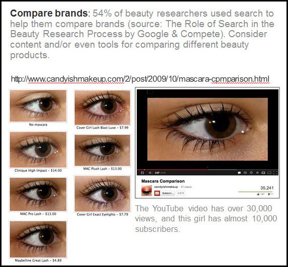 - Videos or slideshows comparing different makeup brands (example: different thick lash mascaras or long-lasting lipsticks).