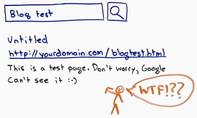 Then, you go and run a search for "blog test" in this case, and everybody on the team's like "What the heck!? WTF? Why am I seeing this page show up in search results?"