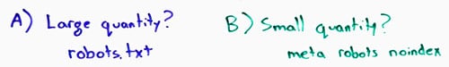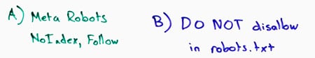 Do NOT, however, disallow those in robots.txt—many, many folks make this mistake. What happens if you disallow crawling on those, Google can't see the noindex. They don't know that they can follow it. Granted, as we talked about before, sometimes Google doesn't obey the robots.txt, but you can't rely on that behavior. Trust that the disallow in robots.txt will prevent them from crawling. So I would say, the meta robots "noindex, follow" is the way to do this.