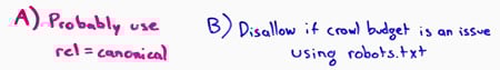 Remember, rel canonical is one of those things that can be precluded by disallowing. So, if I were to disallow these from being crawled, Google couldn't see the rel canonical back, so if someone linked to the blue version instead of the default version, now I potentially don't get link credit for that. So what I really want to do is use the rel canonical, allow the indexing, and allow it to be crawled. If you really feel like it, you could also put a meta "noindex, follow" on these pages, but I don't really think that's necessary, and again that might interfere with the rel canonical.