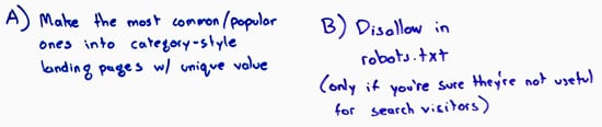 However, that being said, if you've got a long tail of these, or if you'd say "hey, our internal search engine, that's really for internal visitors only—it's not useful to have those pages show up in search results, and we don't think we need to make the effort to make those into category landing pages." Then you can use the disallow in robots.txt to prevent those.