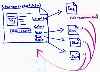 What about, "Should I noindex, nofollow, or potentially disallow crawling on largely duplicate URLs or thin content?" I've got an example. Let's say I'm an ecommerce shop, I'm selling this nice Star Wars t-shirt which I think is kind of hilarious, so I've got starwarsshirt.html, and it links out to a larger version of an image, and that's an individual HTML page. It links out to different colors, which change the URL of the page, so I have a gray, blue, and black version. Well, these four pages are really all part of this same one, so I wouldn't recommend disallowing crawling on these, and I wouldn't recommend noindexing them. What I would do there is a rel canonical.