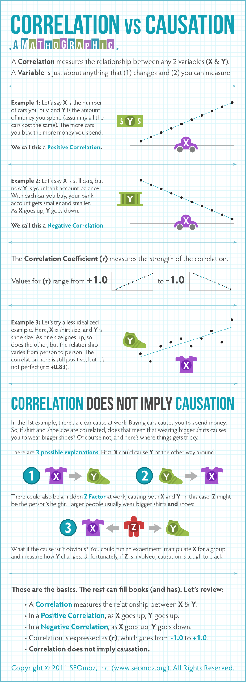 As part of our quest to understand the Algorithm, we do a lot of correlation analysis here at SEOmoz. We tend to dive right into the deep end, so I thought it might be a good time to take a step back and talk about the absolute basics of correlation, including some warnings about causation. We’ll often say (and hear) the fallback phrase – “correlation does not imply causation”, but people rarely dig into what that means.